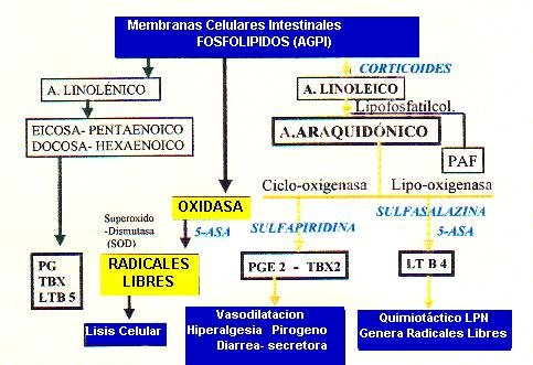 Existen múltiples estudios, casi todos ellos, con defecto de metodología, dado que utilizan como controles el ácido Oleico que como hemos visto, interviene activamente en la posible etiopatogenia de la enfermedad, además la muestra es muy escasa, por lo que los resultados de todos ellos, que demuestran eficacia es más que dudoso. Solo dos estudios, el de Greenfield con 43 enfermos con CU y el de Hawthorne con 87 pacientes son valorables y en sus resultados no encuentran diferencias significativas. Se precisan más estudios controlados.INHIBIDOR DE LA 5-LIPOOXIGENASA.